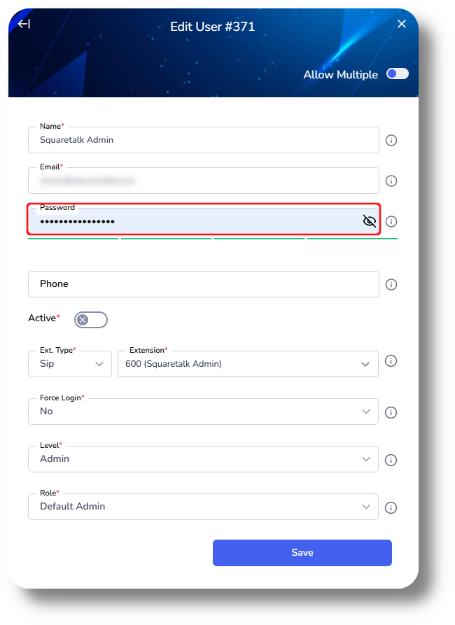 5. To reset the users password, simply type in the new password in the password field to change it and click on "Save":