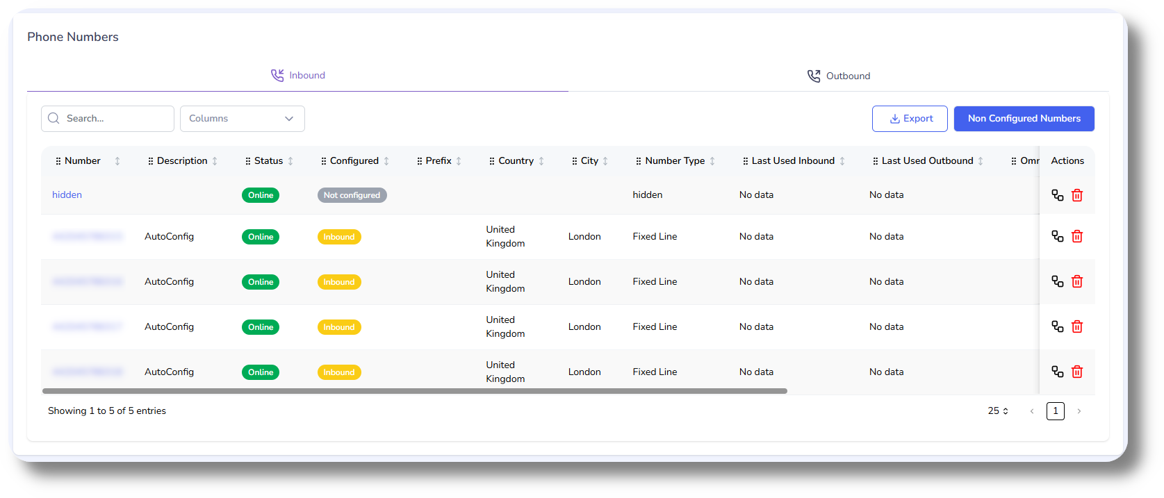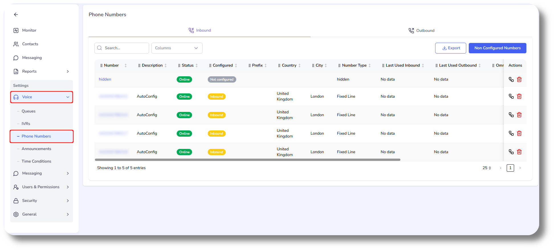 From here you will be able to see your currently assigned numbers, as well as numbers which are not configured can be viewed by clicking on the Non Configured Numbers button: