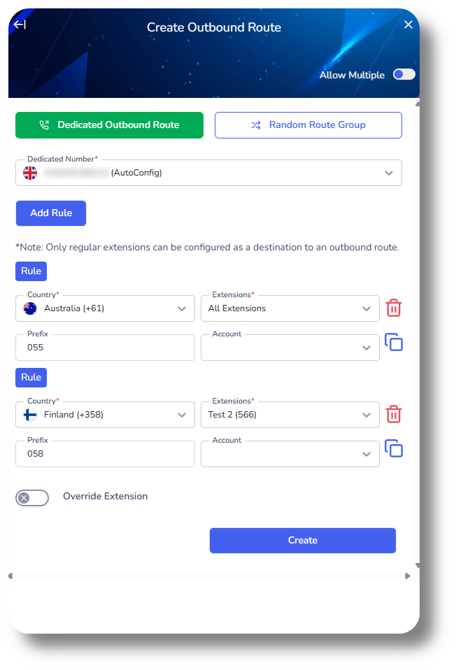 From the Dedicated Number you can select number this route to be for. You can add multiple rules and select different countries or all, as well as specify which extensions could utilize this rule as well as specify a prefix.