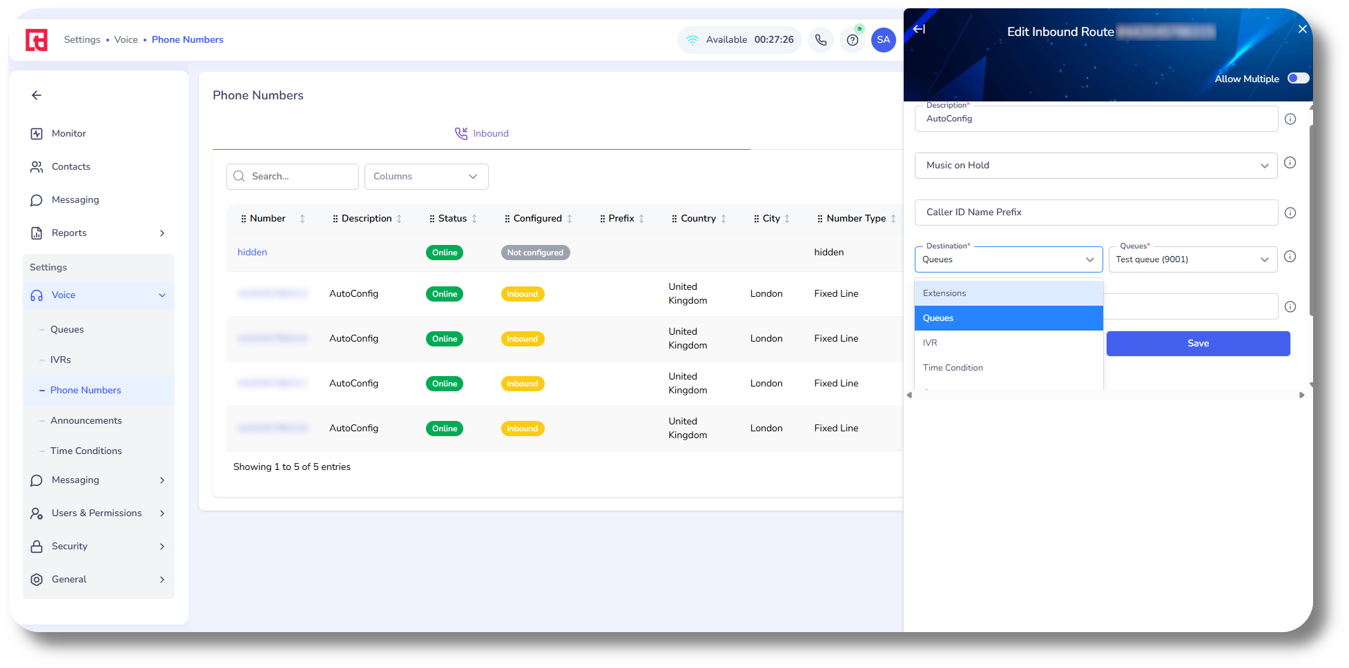 To configure the Incoming Route of a number/DID, simply click on it. In the Incoming Route you can set the Music on Hold, a Caller ID Name Prefix as well as the Destination;