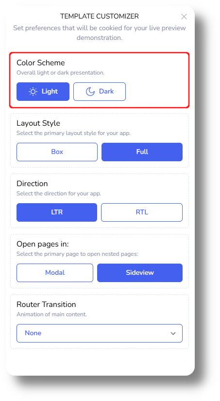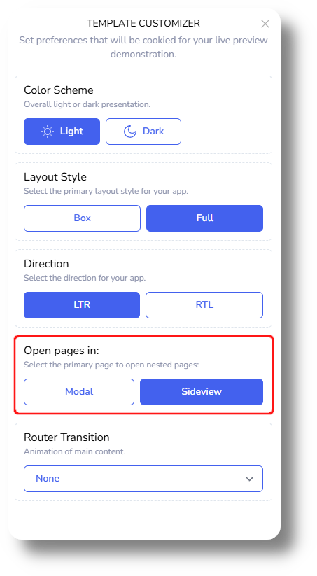 5. You can also specify how the options should open, sideview will open the to the side and model will open them in a separate window in the middle of the screen: