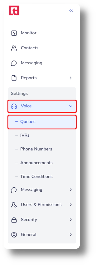 1. Click on "Voice" under the "Settings" section and the navigate to "Queues":