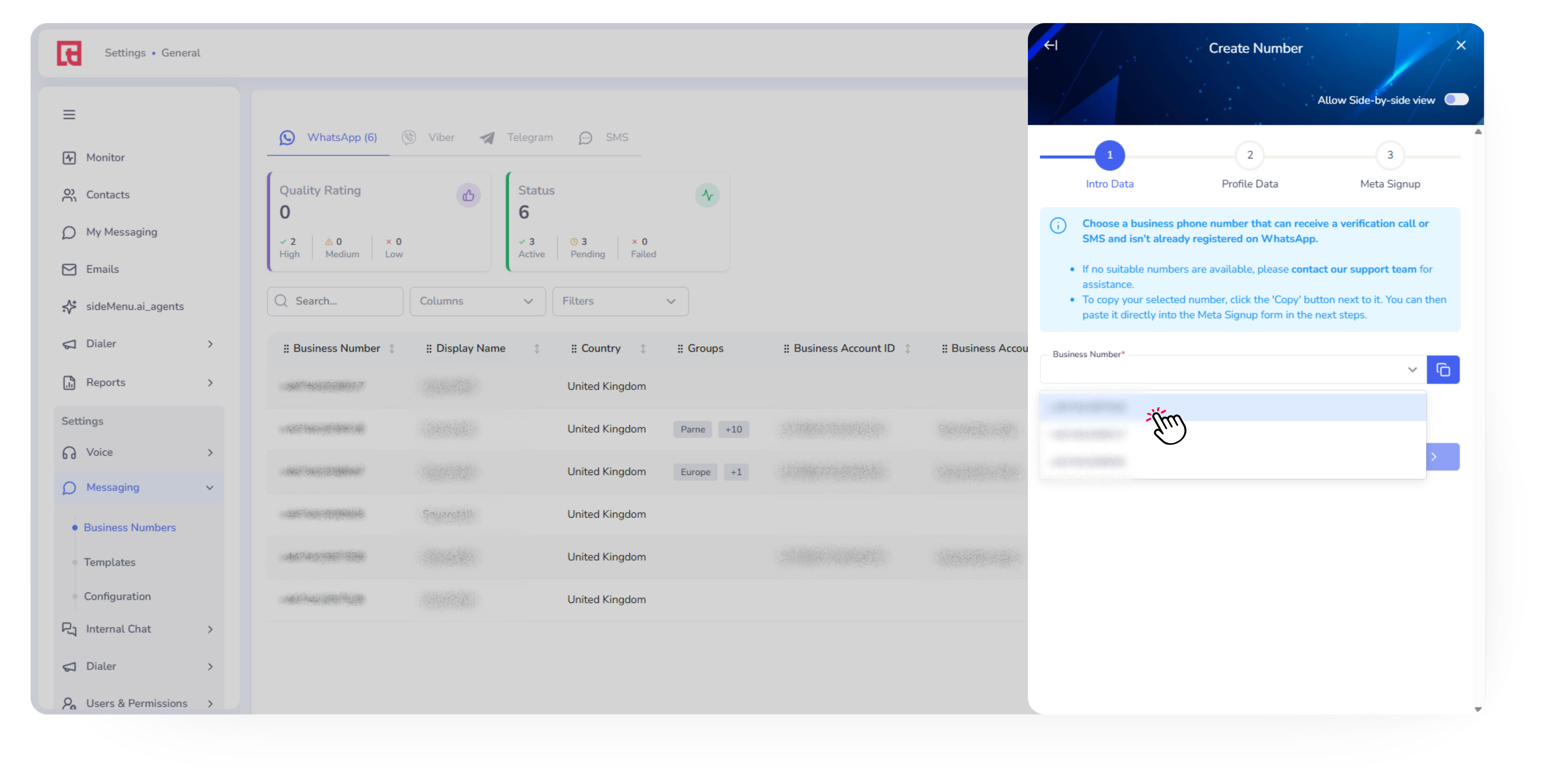 Go to Settings → Messaging → Business Numbers and click “+ Add Business Number”