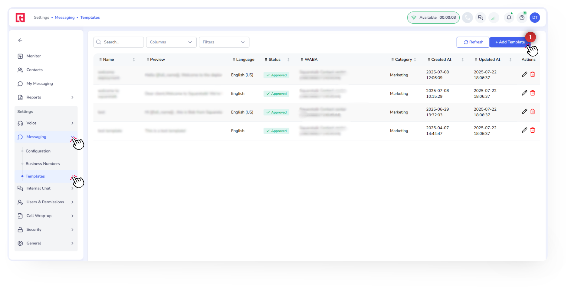 How to Edit and Delete WhatsApp Templates WhatsApp message templates in Squaretalk can be edited or deleted from the Templates page. However, editing rules depend on the template status, because WhatsApp templates are regulated by Meta. Go to ...