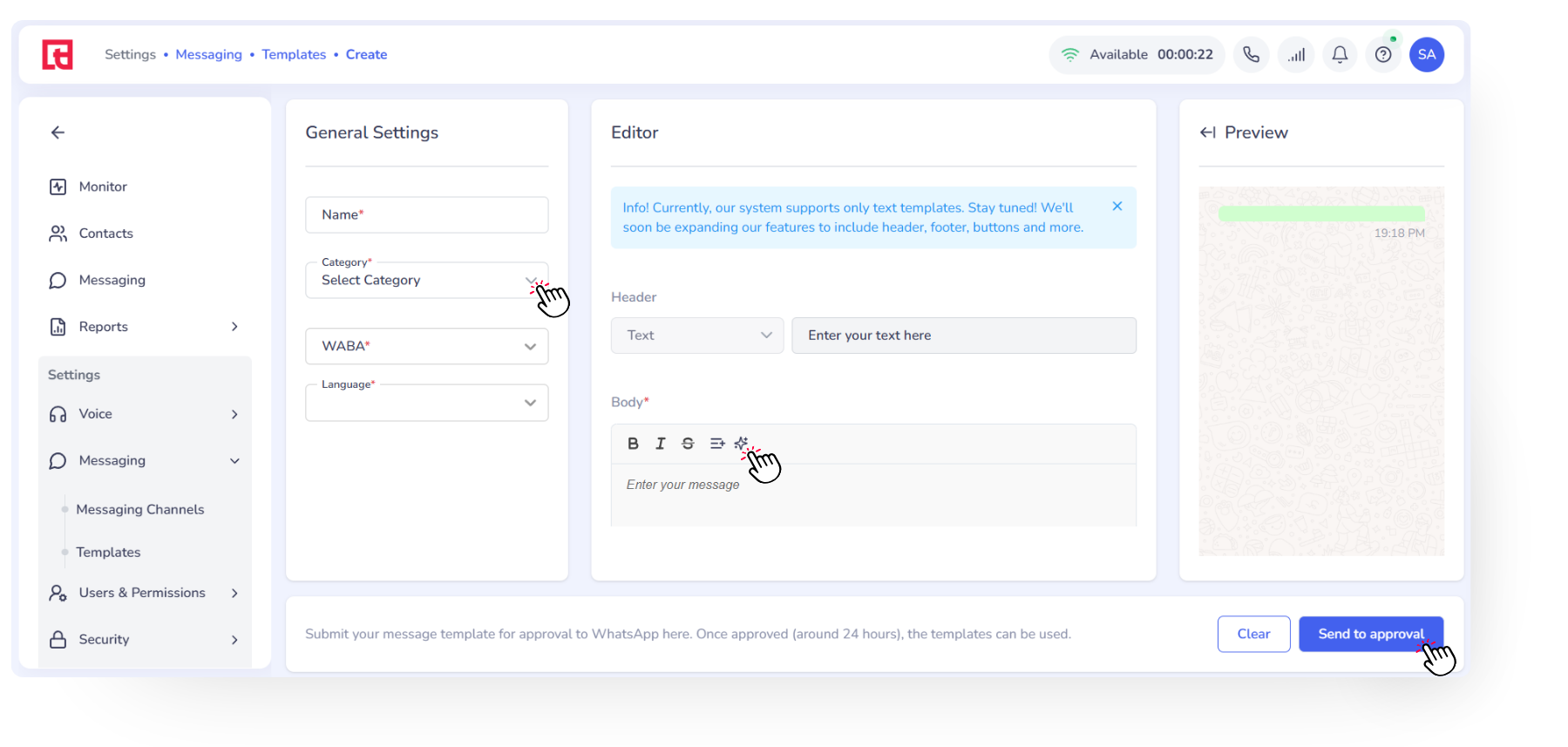 Go to Settings → Messaging → Templates and click “+ Add Template”