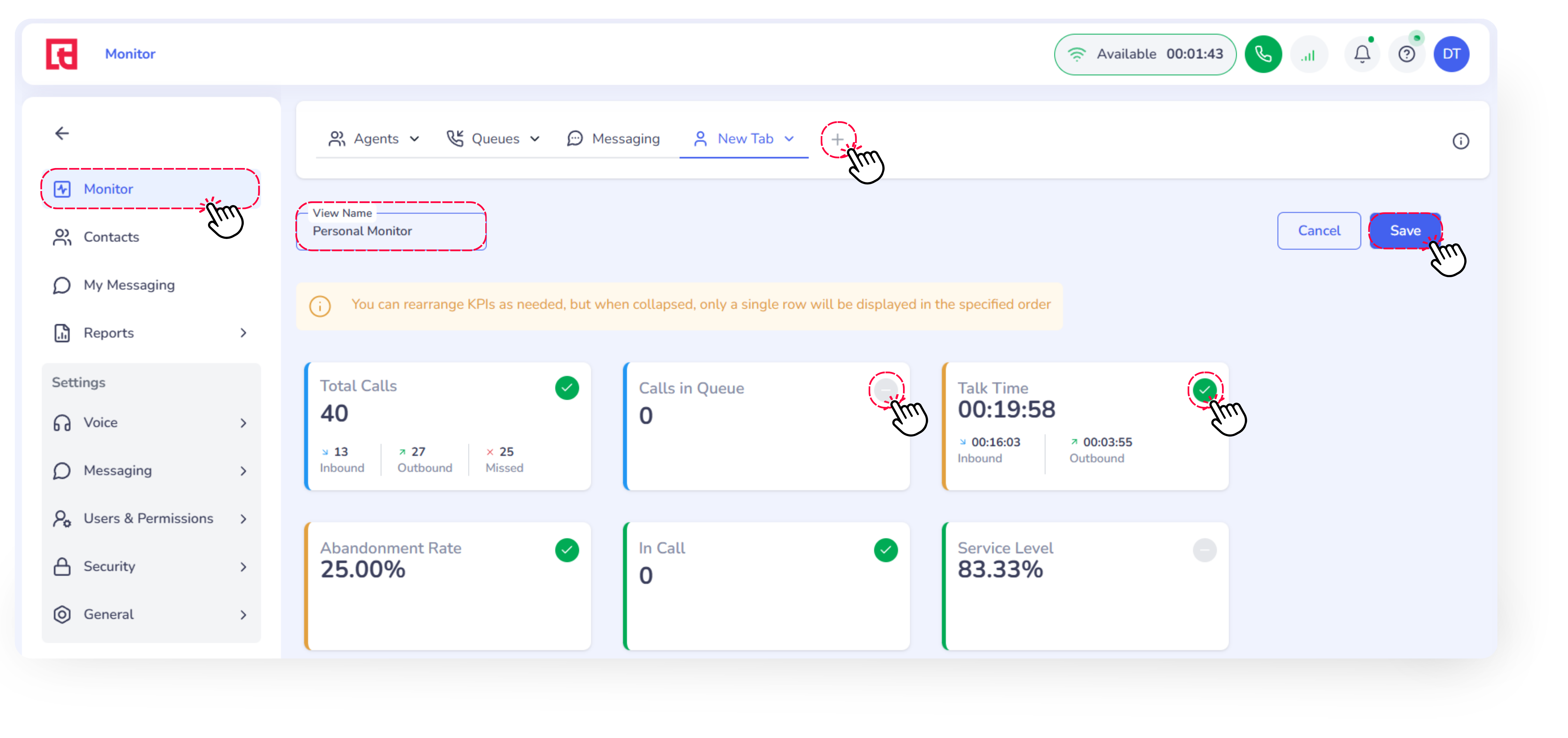 - Give your monitor view a name. (example: Morning Shift, Sales Team Live, or Support Overview). Choose and rearrange your KPIs.