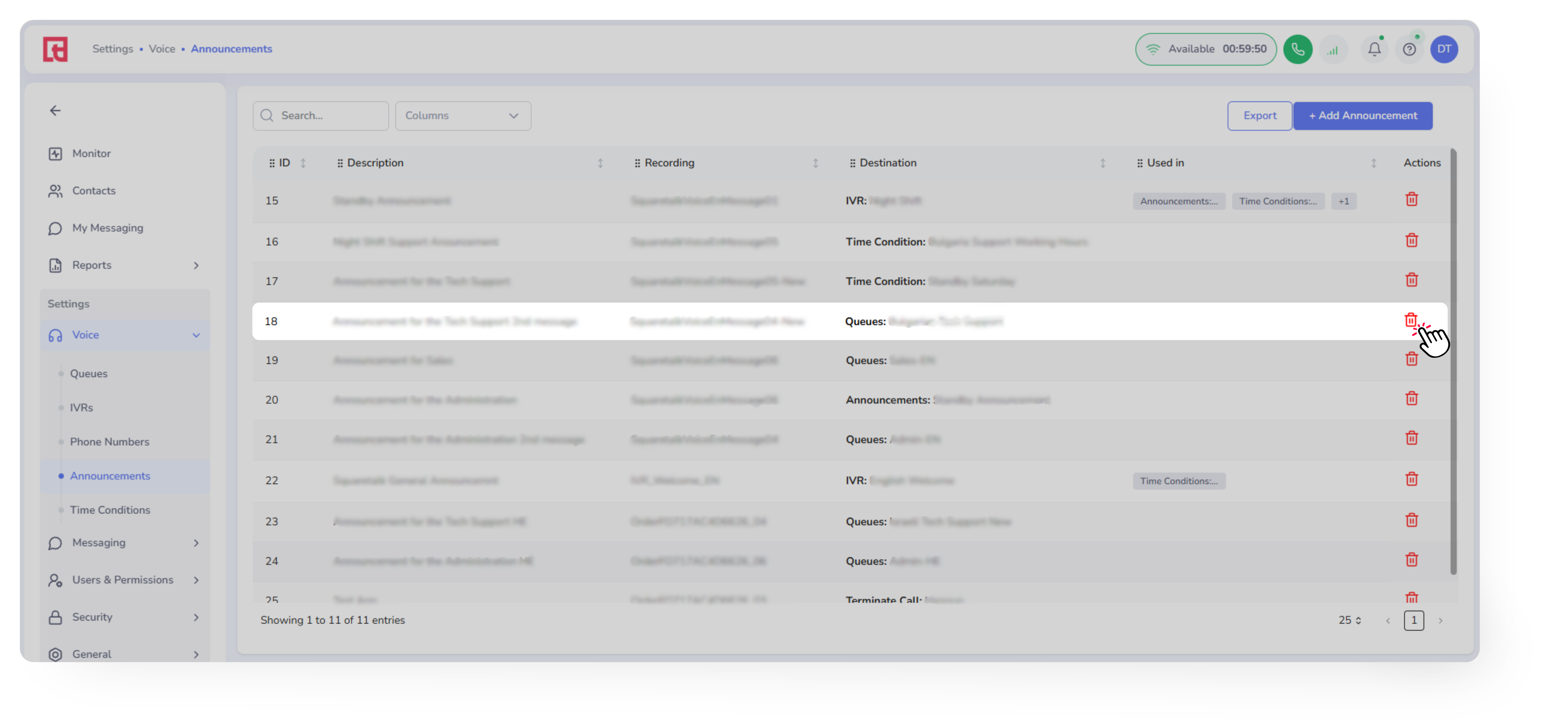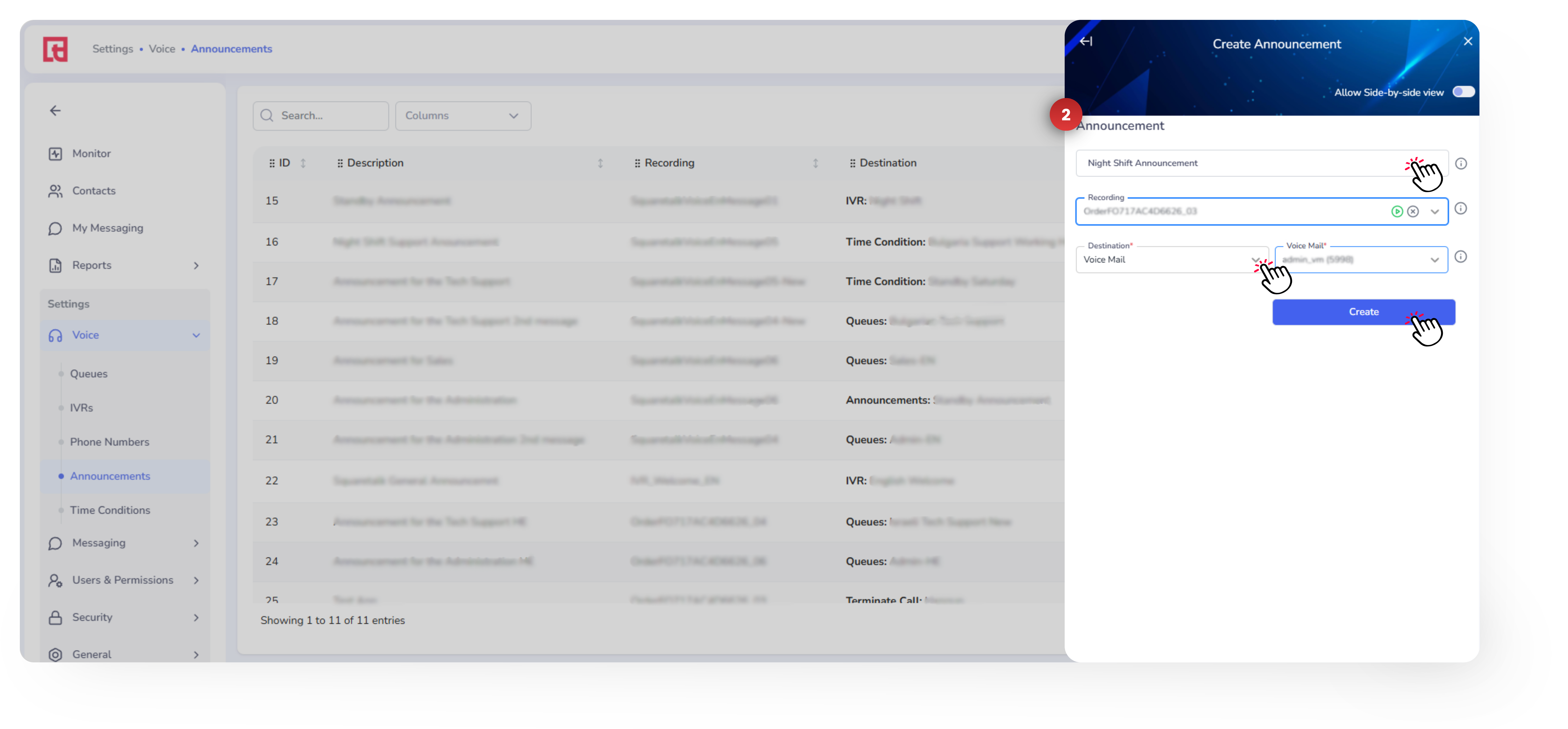 Go to Settings → Voice → Announcements and click “+ Add Announcement”