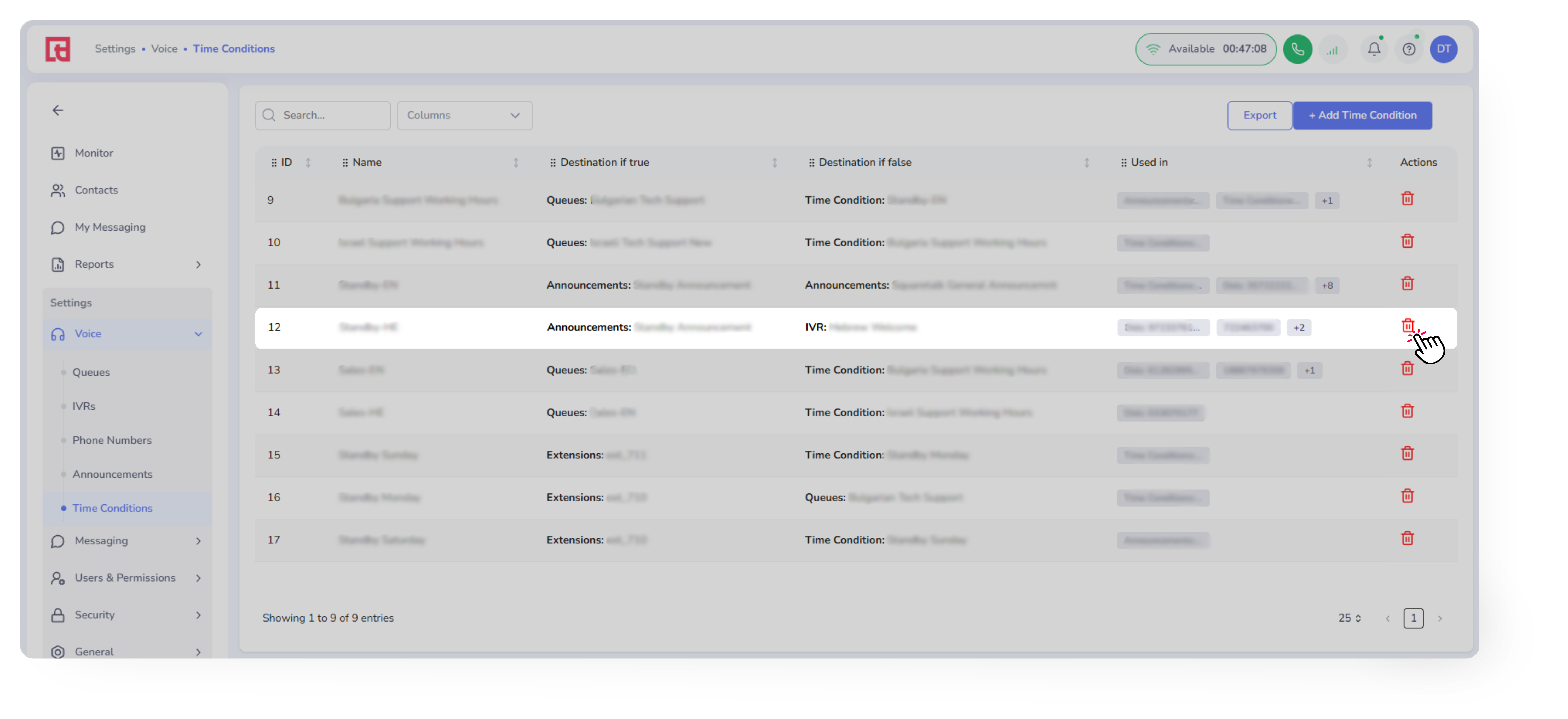 Once completed, click on the trash bin icon under the Actions column to delete the Time Condition.