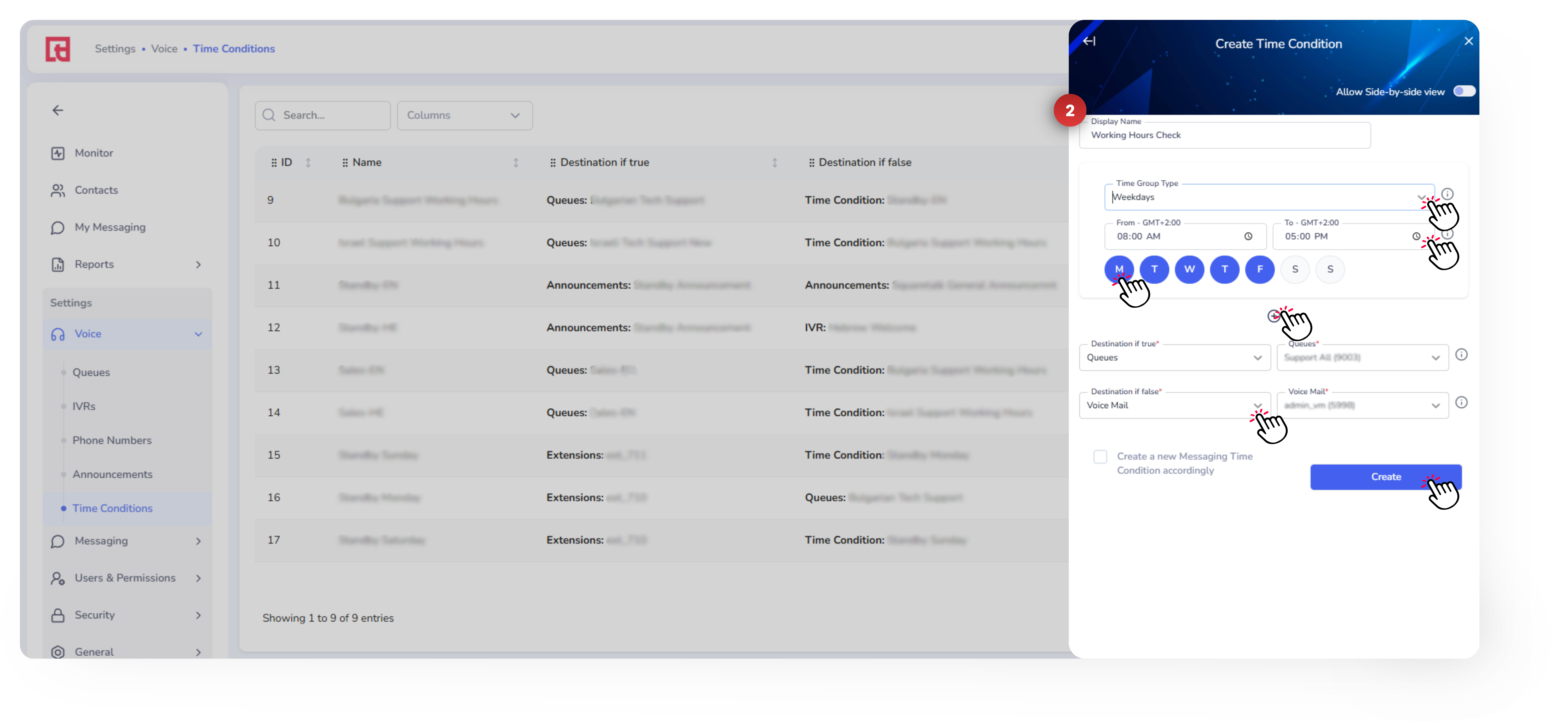 Go to Settings → Voice → Time Conditions and click “+ Add Time Condition”