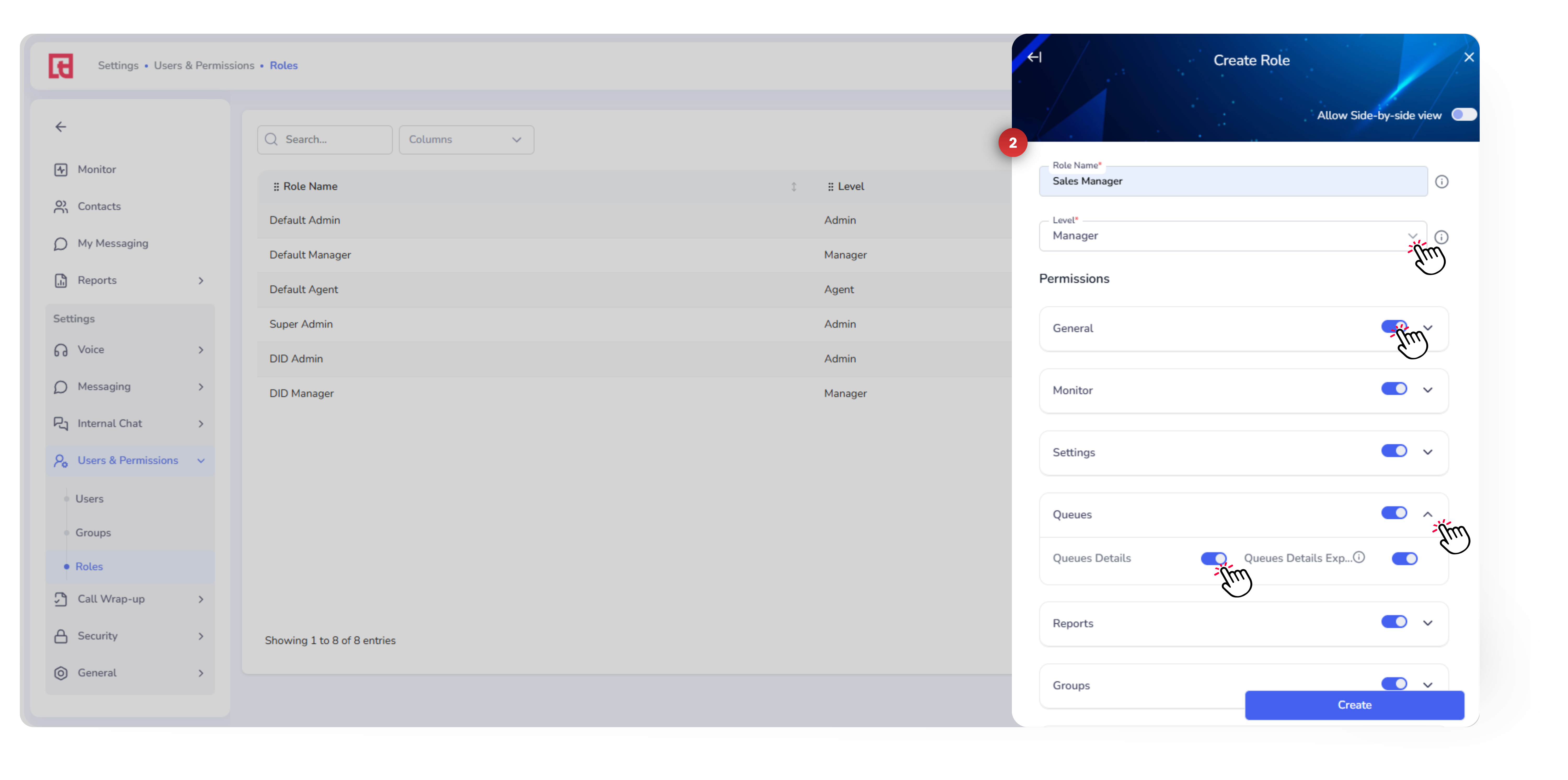 Give a Name to your Role (for example, Support Supervisor), and select the Level (Admin, Manager, Agent).
