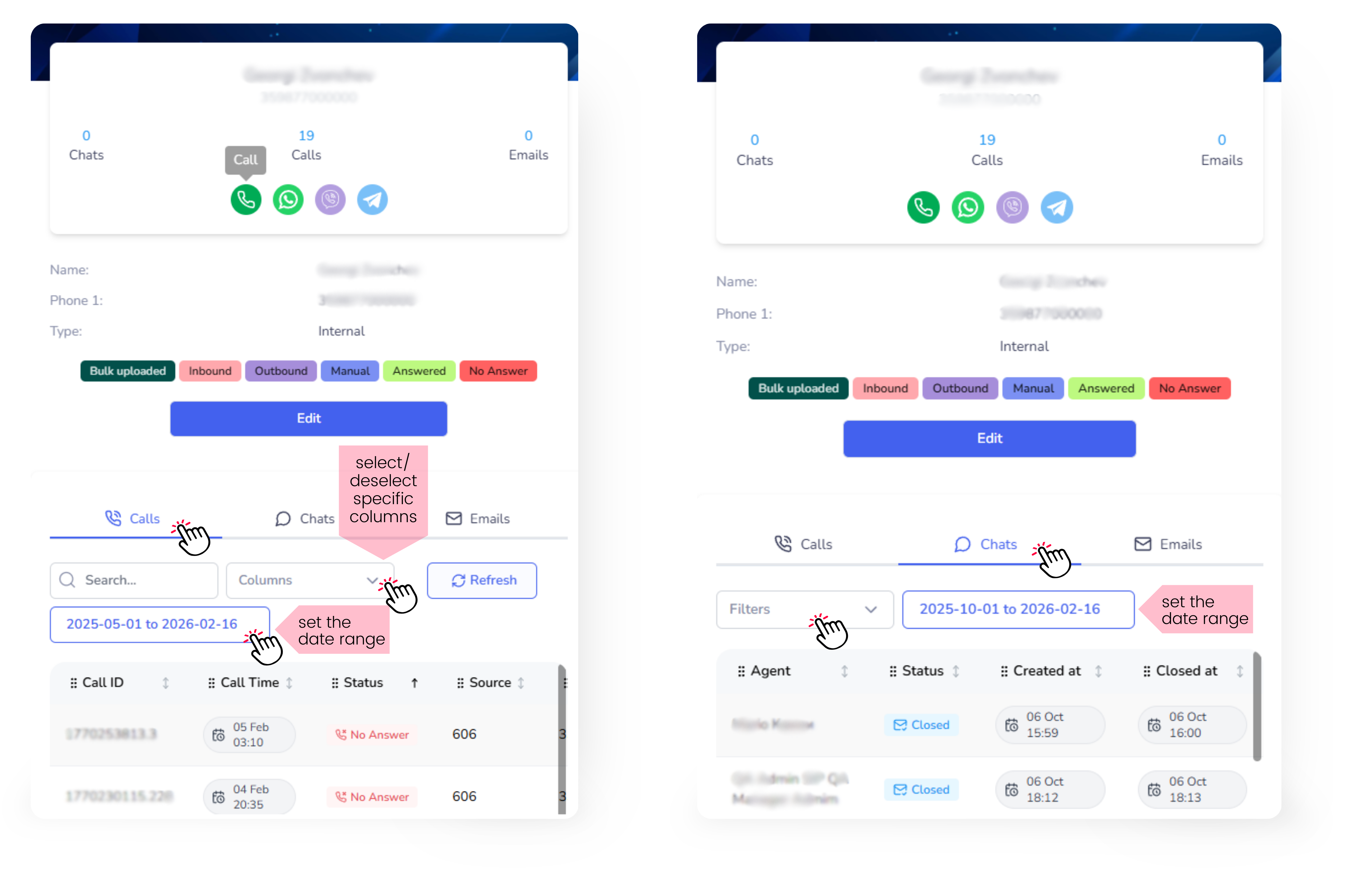 Each contact includes a history of previous interactions that can be found in the reports, but also in the contact details panel.