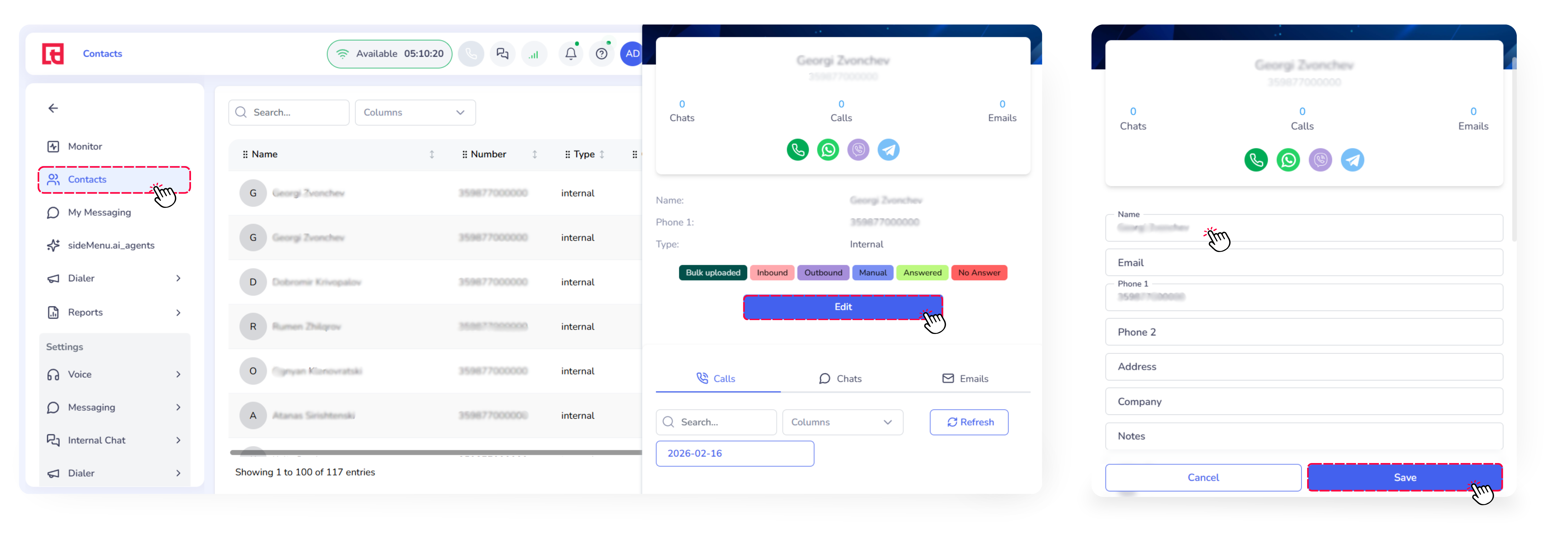 Contacts Tab: Overview and Key Features The Contacts tab in Squaretalk helps you store and manage customer and internal contact details in one place. What Can You Do in the Contacts Tab? From the Contacts tab, you can: Search for contacts by name or ...