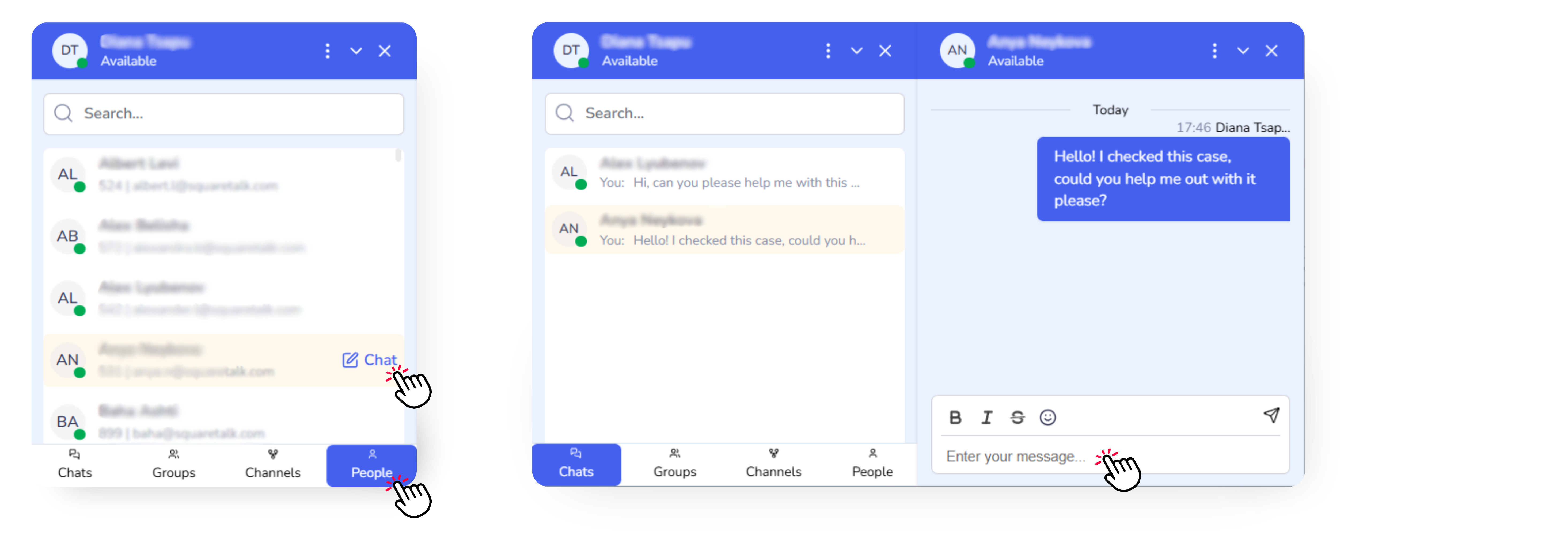 To start a chat, just go to People and select a user you want to start a conversation with.