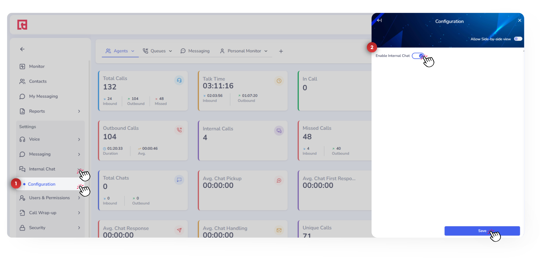 Once enabled, the feature becomes available immediately for all users inside your system. (Check the chat icon that will appear in the top banner, next to the phone icon.)