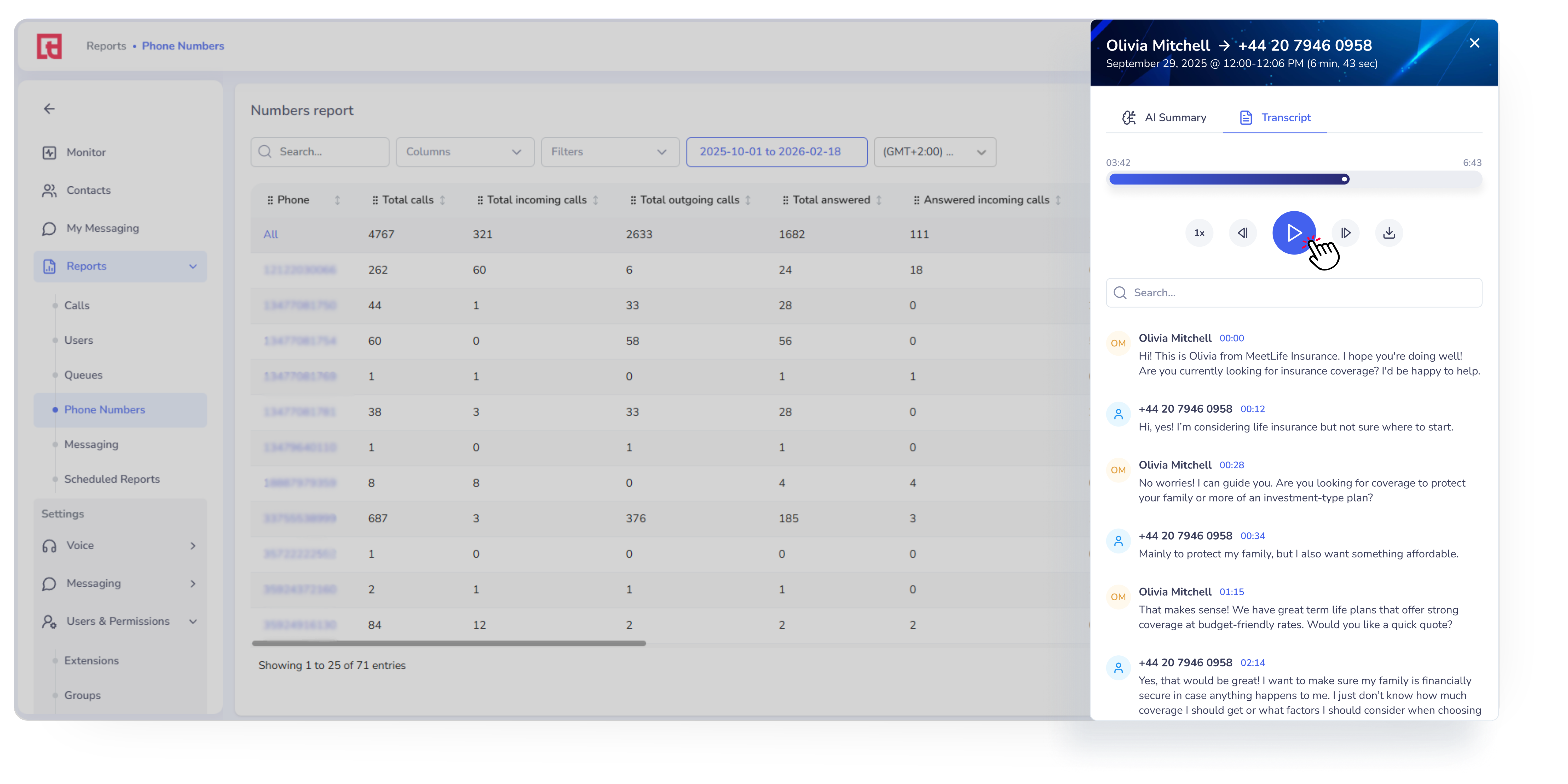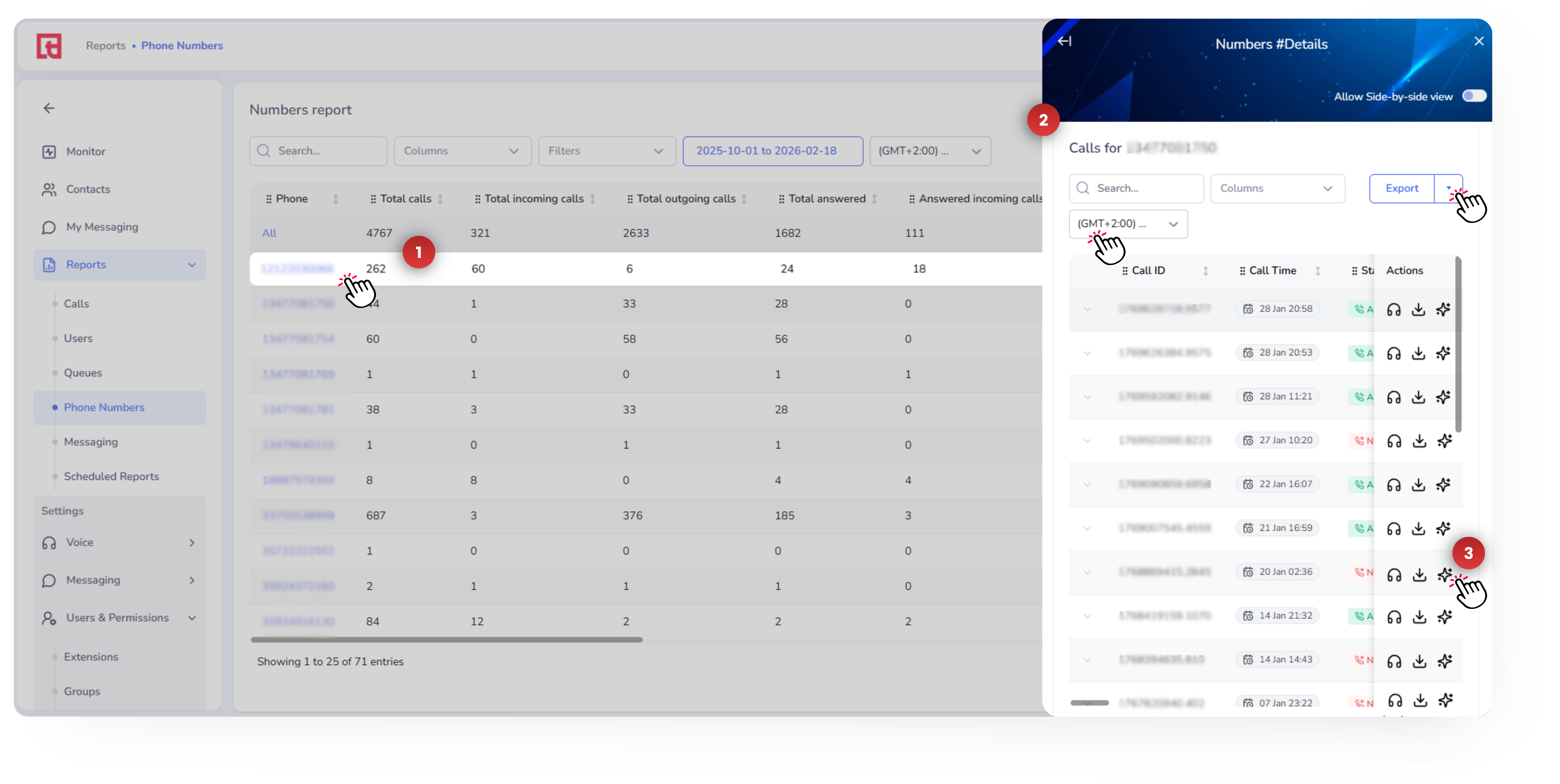 📌Note 2: Call recordings shown in the Phone Numbers Report depend on the extension’s recording settings. If recordings are disabled for a specific extension or call type, those calls will not have recordings available in reports.