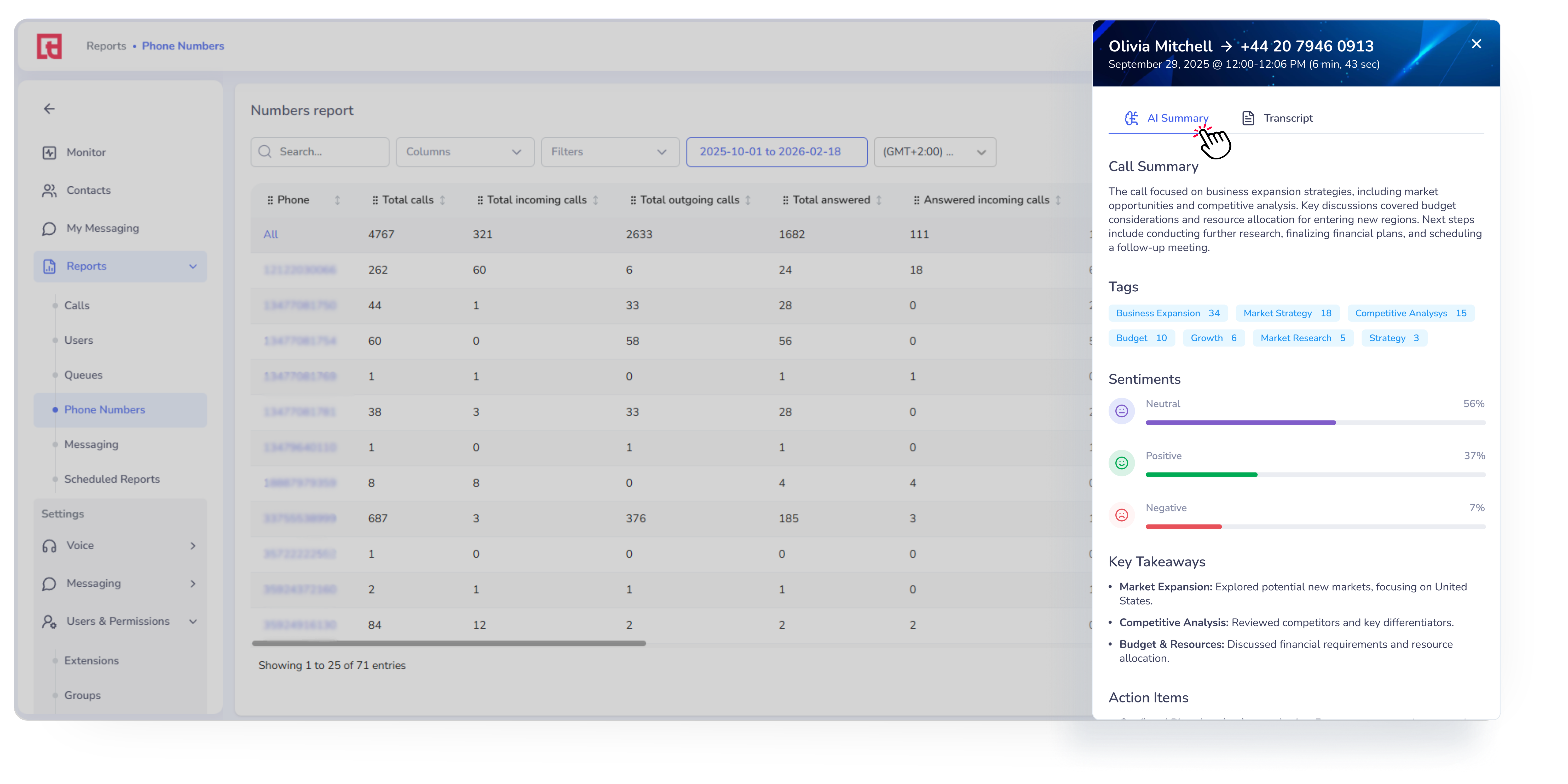AI Assistance: call summary, sentiment analysis, and transcript