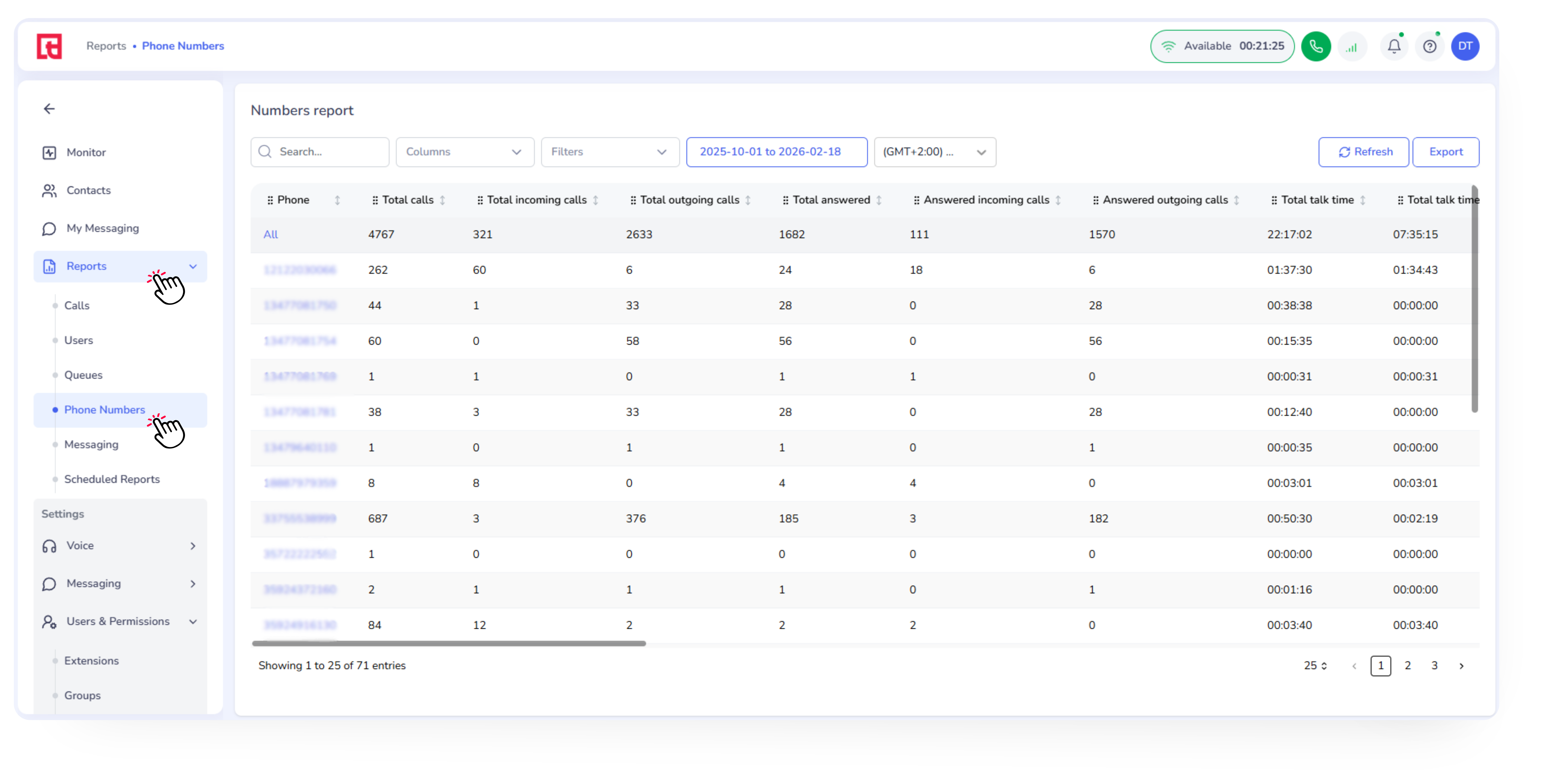 You will see a list of your phone numbers with related call statistics for the specified date range.