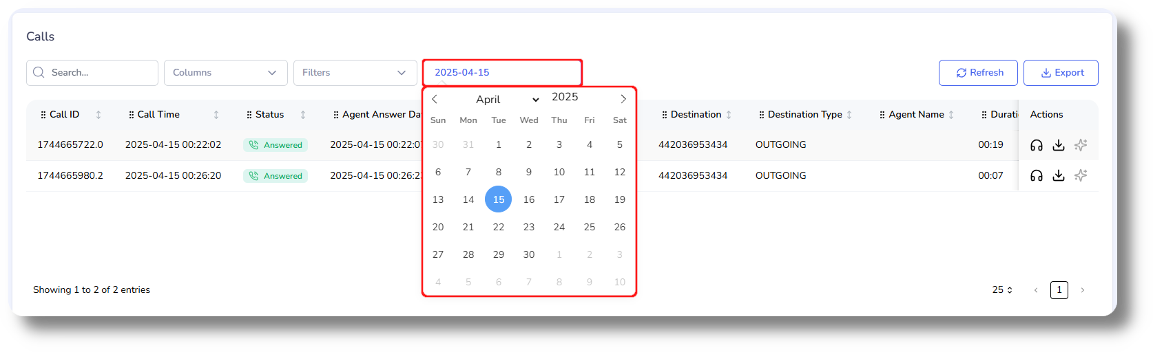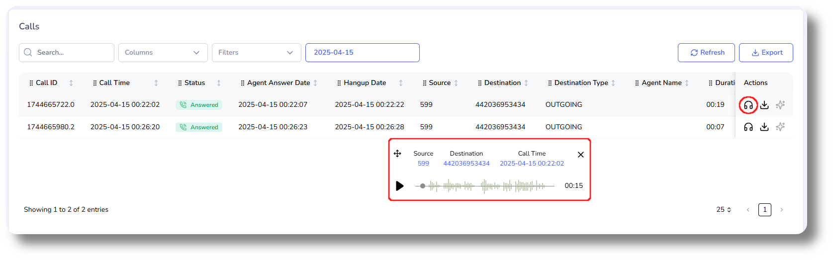 The Calls report allows you to review all calls made via the SquareTalk New Contact Center as well as listen to the call recordings.