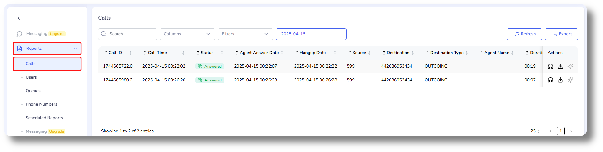 1. Navigate to the Reports section from the left and then the Calls tab: