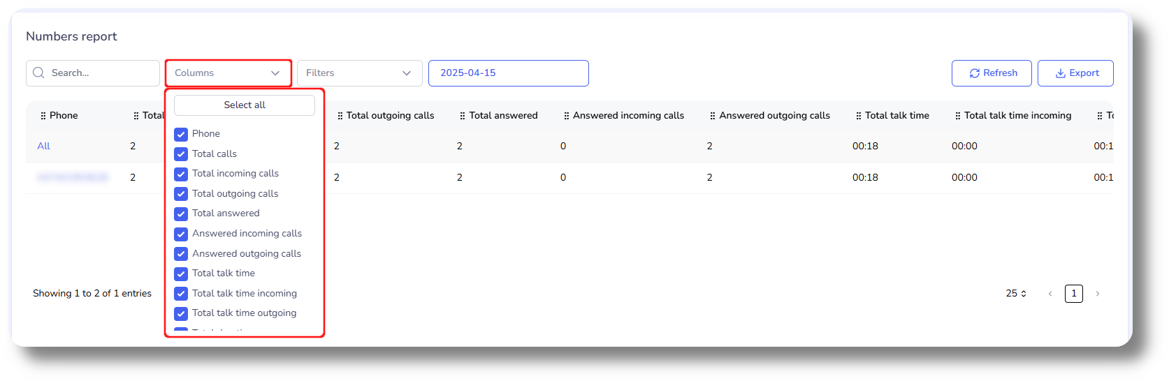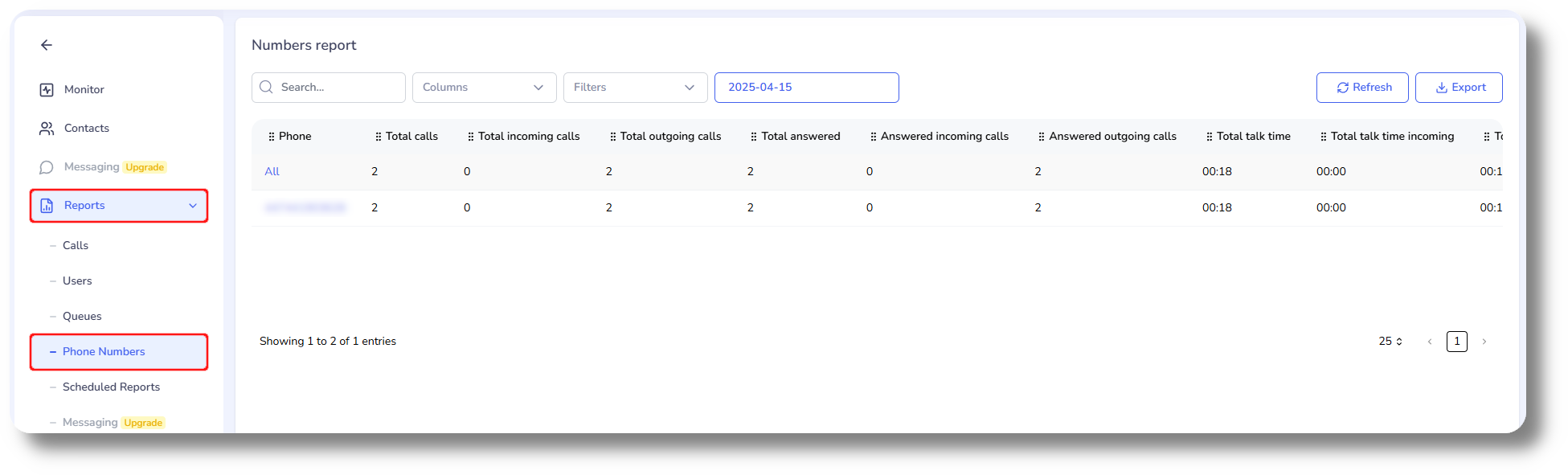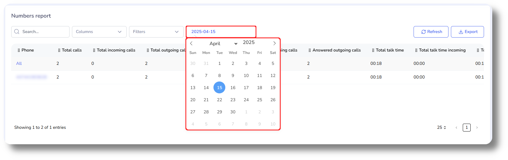The Phone numbers report allows you to review all calls made on a phone number level, for a specific date/day.