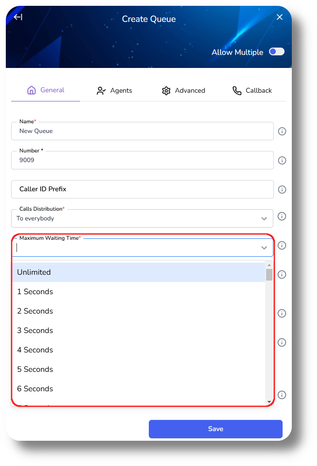 7. Click "Maximum waiting time" to set up the maximum number of seconds a caller can wait in a queue before being pulled out of the queue: