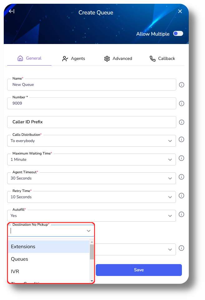 11. Click 'Destination when no pickup' to choose what will happen with the call if no agent from the queue managed to pick up the call: