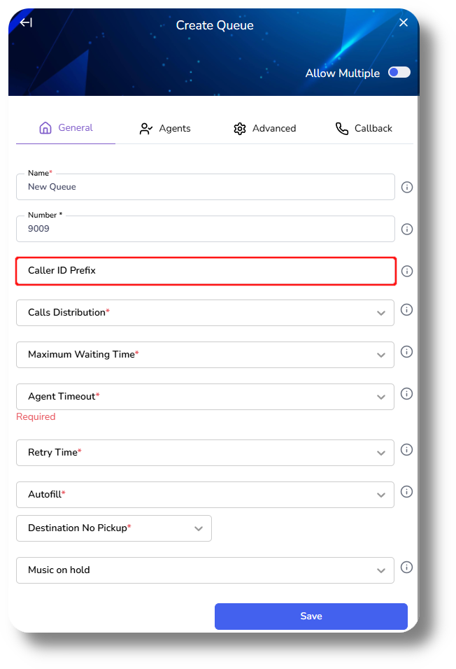 5. Click on the "Caller ID name Prefix" field to optionally prefix the CallerID name of callers to the queue: