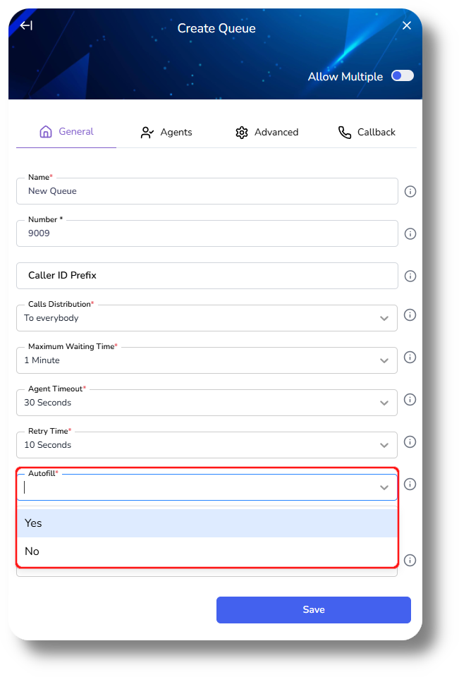 10. If you set the "Autofill" option to 'Yes' and multiple agents are available, the system will send one call to each waiting agent (depending on the ring strategy). Otherwise, it will hold all calls while it tries to find an agent for the top call in the queue making other calls wait: