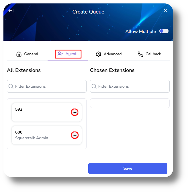 13. Click the 'Agents' tab to choose which users you would like to assign to this queue, simply click the "+" to add them: