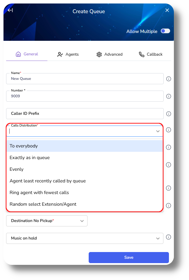 6. Click "Calls Distributions" to choose how the calls are distributed in the queue: