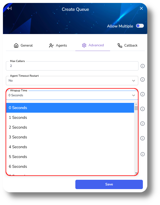16. Click "Wrap Up Time" to choose the seconds after a successful call needs to be held before sending a potentially free agent another call. This option is ideal for agents that need to leave long disposition statuses or have a lot of wrap up work after each case:
