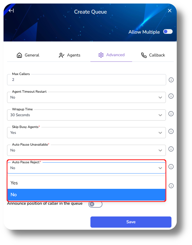 19. Click "Auto-pause Reject" to set to 'Yes' or 'No' If set to Yes, any agent with Force Login=True (logged in the system) that missed a received call will be set to Pause Reject status. If set to 'No' this option will not apply: