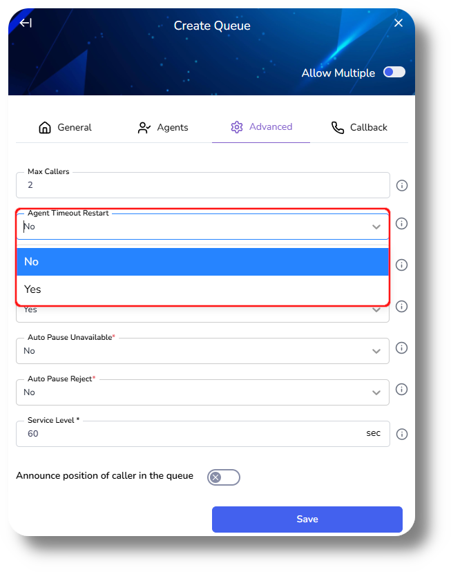 15. Click "Agent Timeout Restart" option to set the timeout for an agent to answer a call is reset in a case if an agent declines or does not answers a call. The agent will get higher priority to answer the next call. If set to No, the agent will not receive higher priority if they do not answer a call: