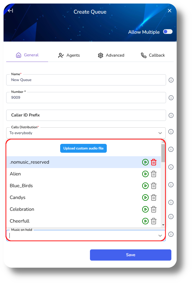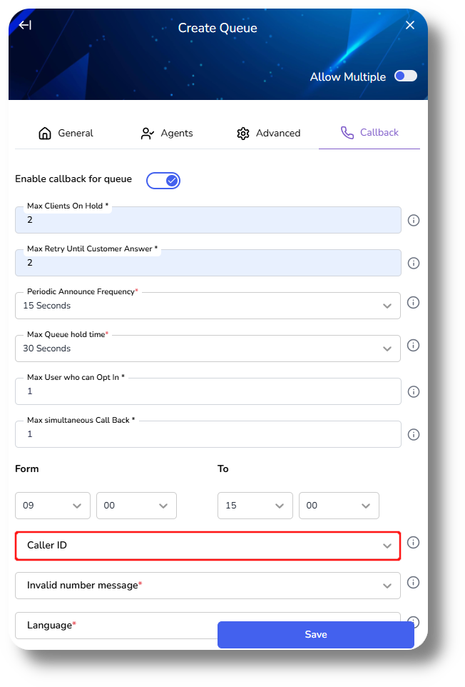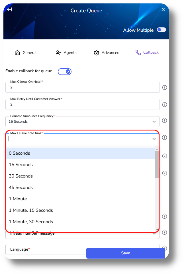 Announce estimated hold time of caller in the queue: If enabled will announce an estimated hold time of the caller in the queue.22. Click the "Callback" tab to configure a Callback option for your agents: