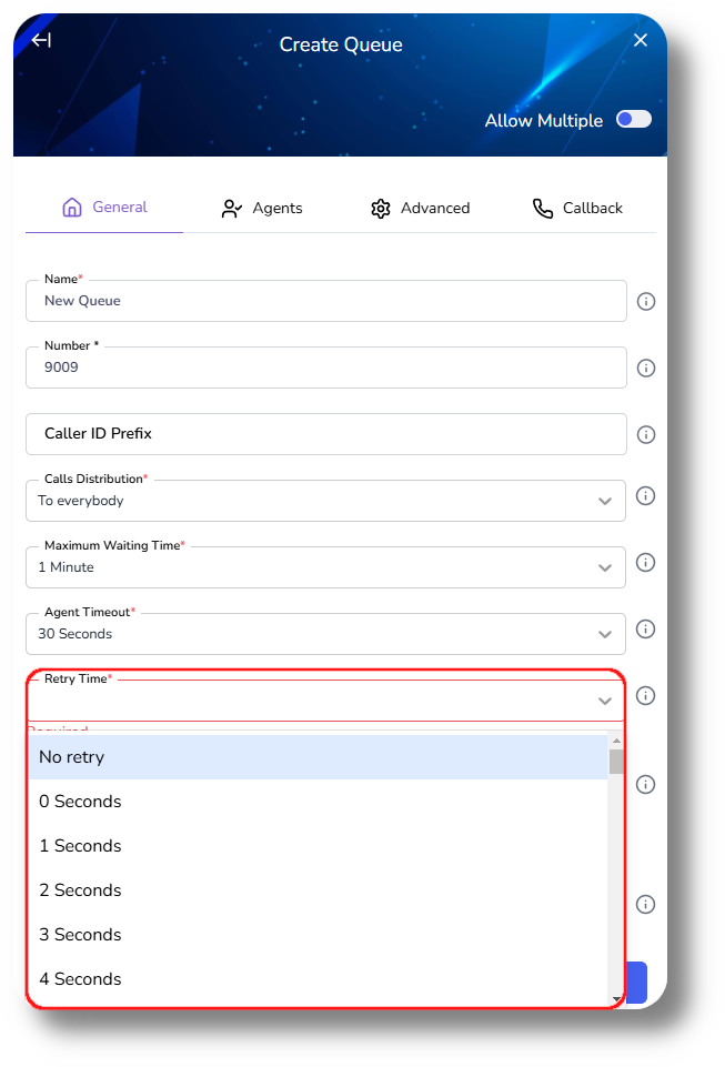 8. Click on the "Agent Timeout" field to set a time for the call before it is forwarded to the next agent in the queue:
