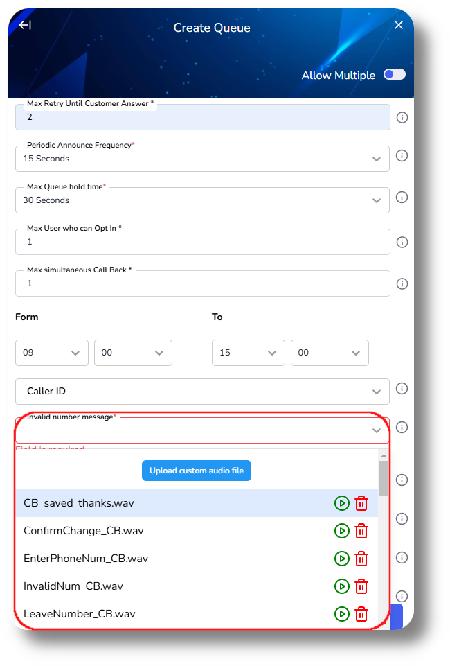 24. Click the "Max Retry till customer answer" to set how many retries the system will do until the customer answers: