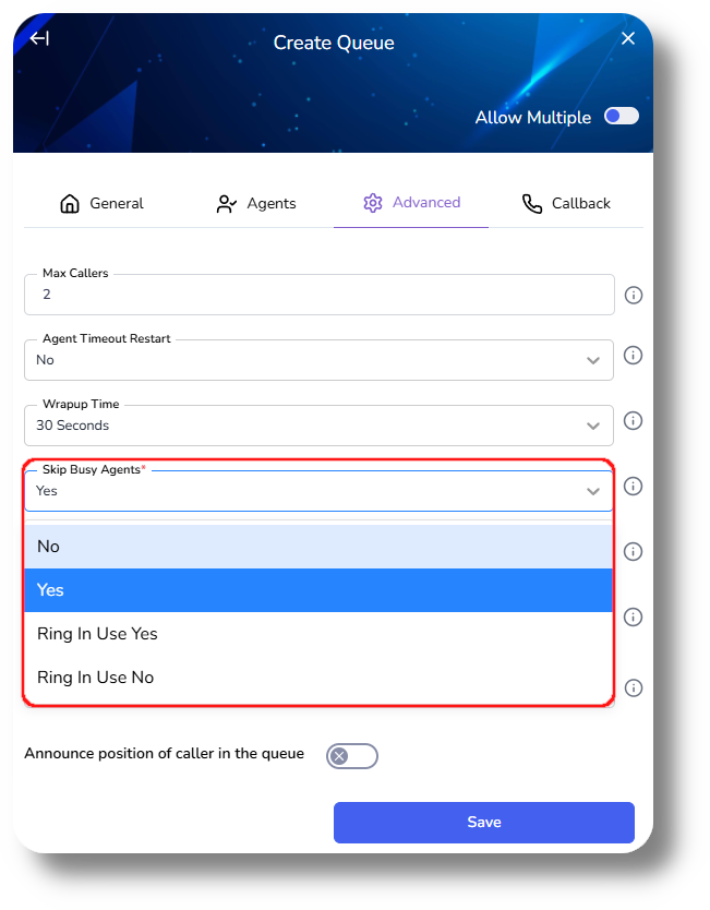 17. Click "Skip Busy Agents" to choose if the calls will be distributed to busy agents or the system will automatically skip them: