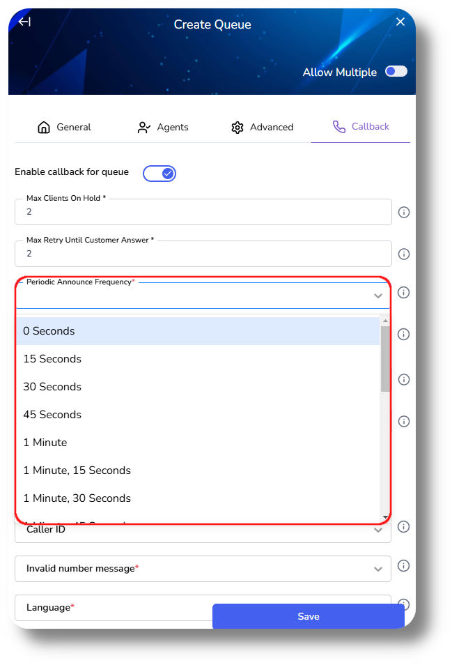 25. Click the "Periodic Announce Frequency" field to choose how often your agents will get notified for the call back. For example if your callbacks are a must and urgent, you can set the announcement to be with a shorter interval between them:
