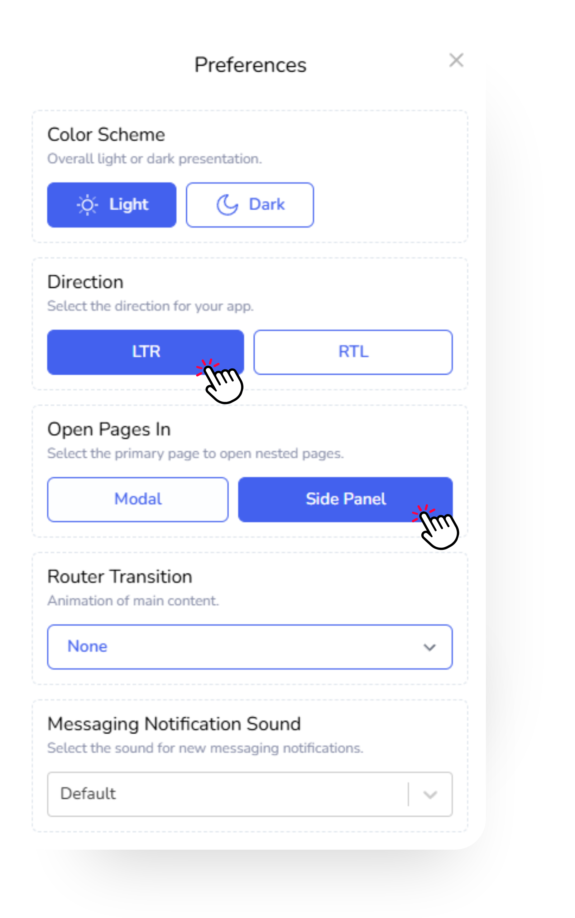 6. Account Settings (Preferences & Personalization). Change the language. Configure the color mode, layout direction (LTR / RTL), page opening behavior (modal/side panel) under Preferences.