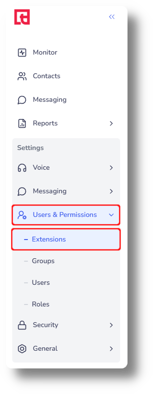 1. To set up a voicemail and enable it for an extension, fist navigate to the Settings and then Extension under the Users & Permissions section: