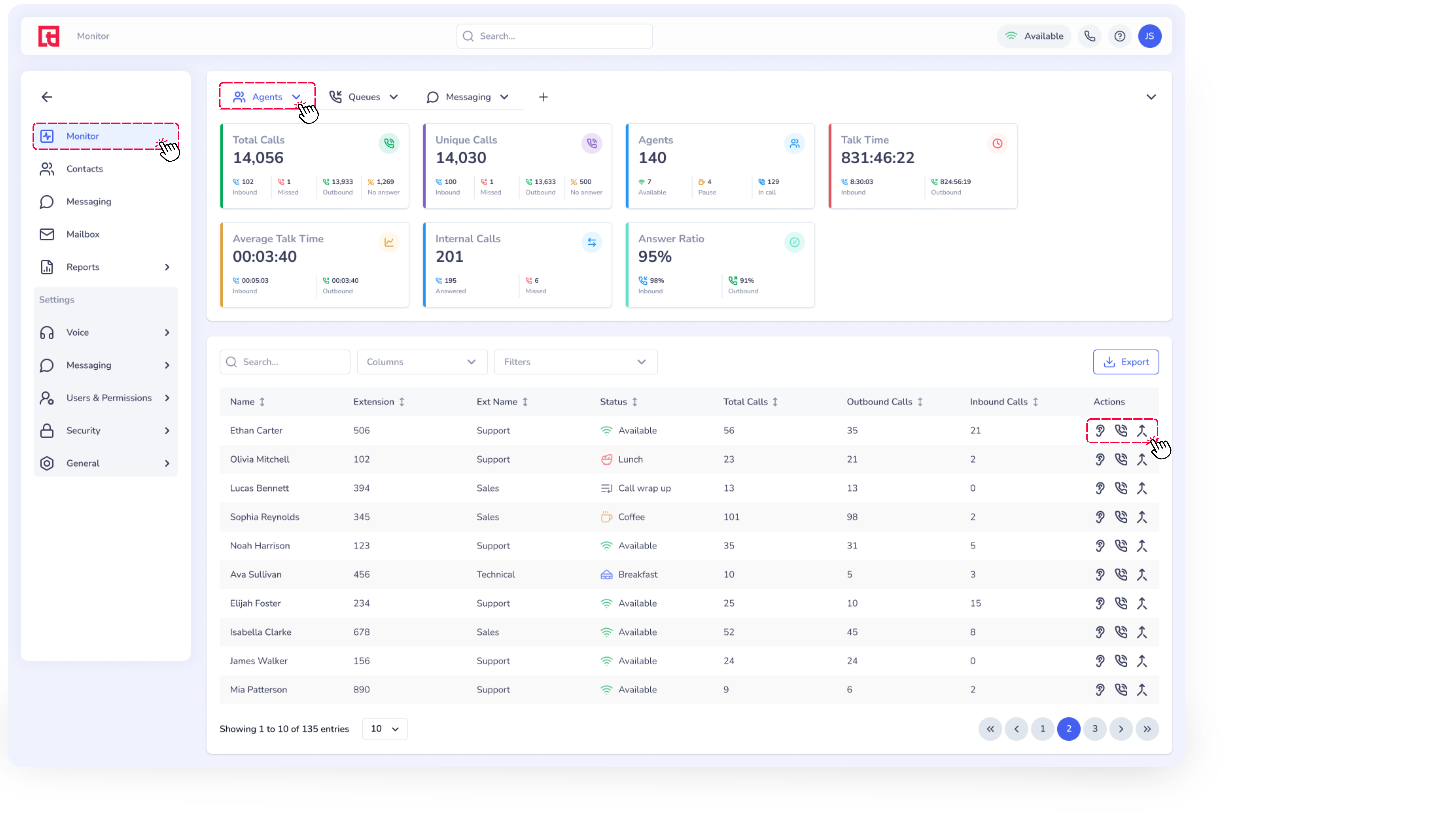 Spy – Listen to an active call silently (the agent and caller won’t hear you).