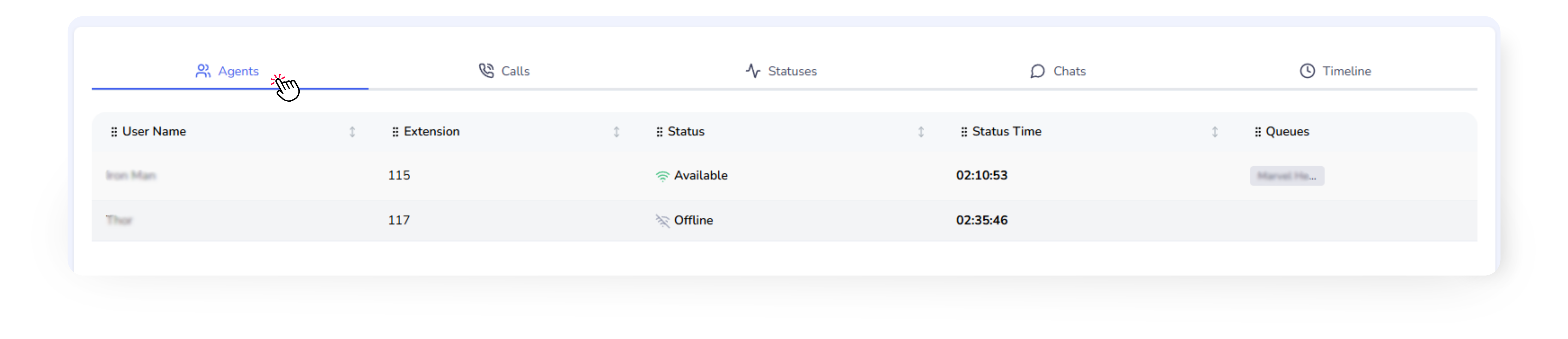 You can see agents who belong to the same group as you, along with their current status under the Agents Tab.