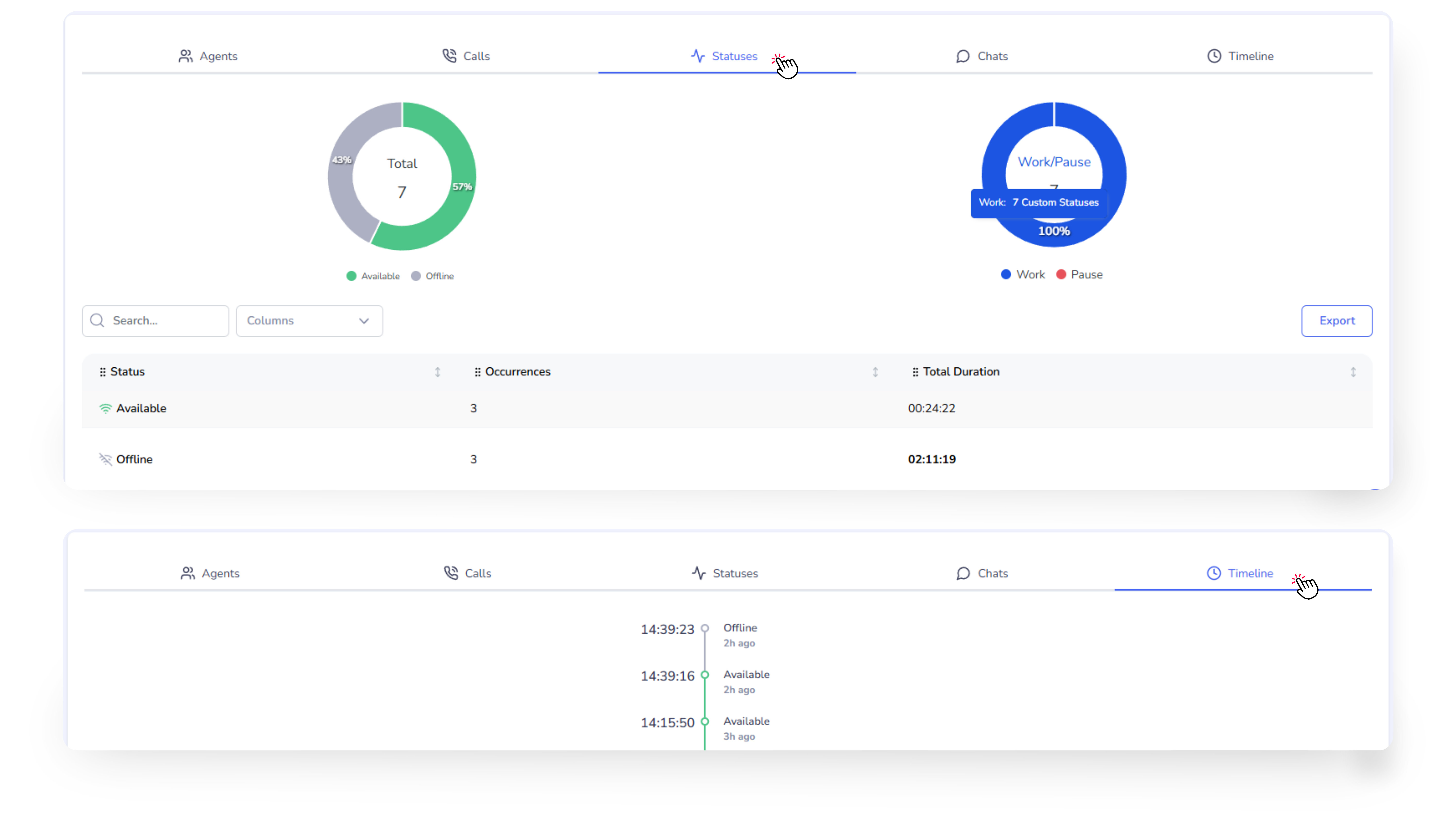 From here, you manage your availability, handle calls and chats, and keep track of everything you’ve worked on without switching tools.