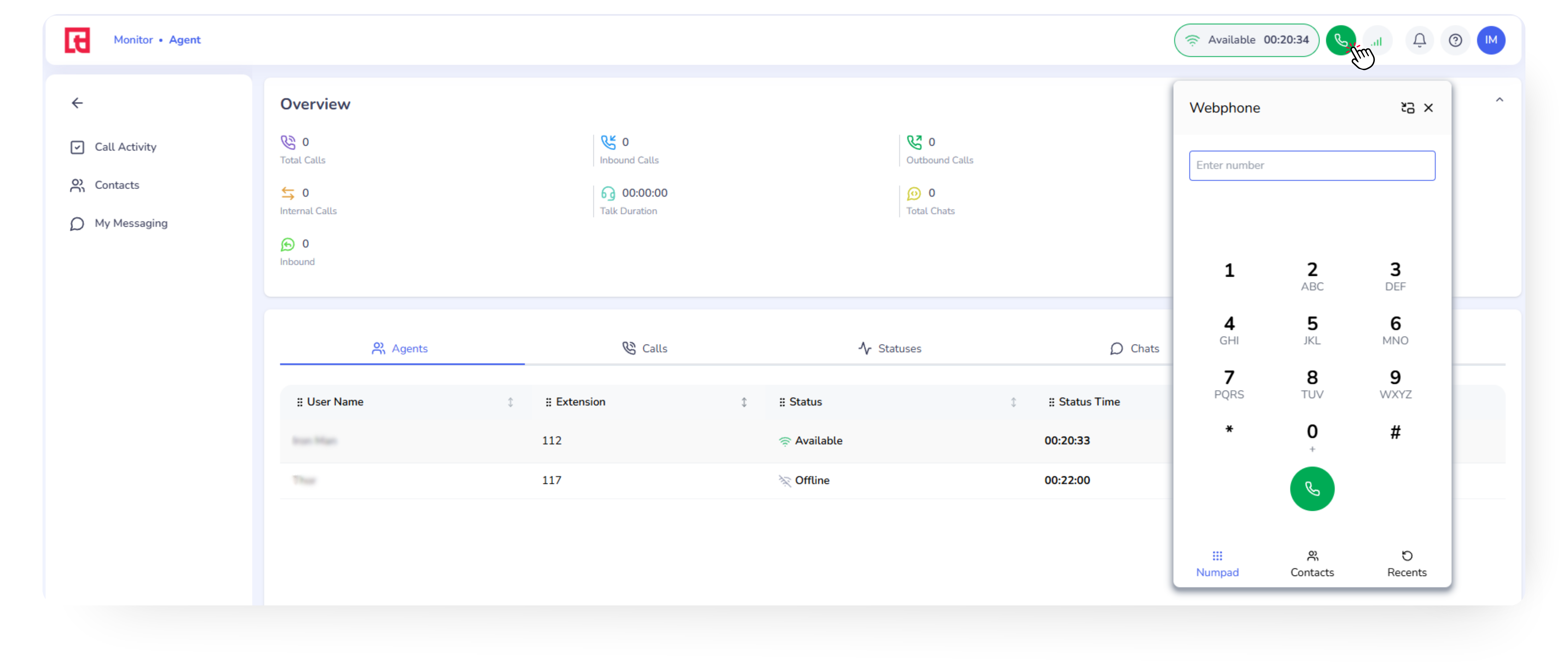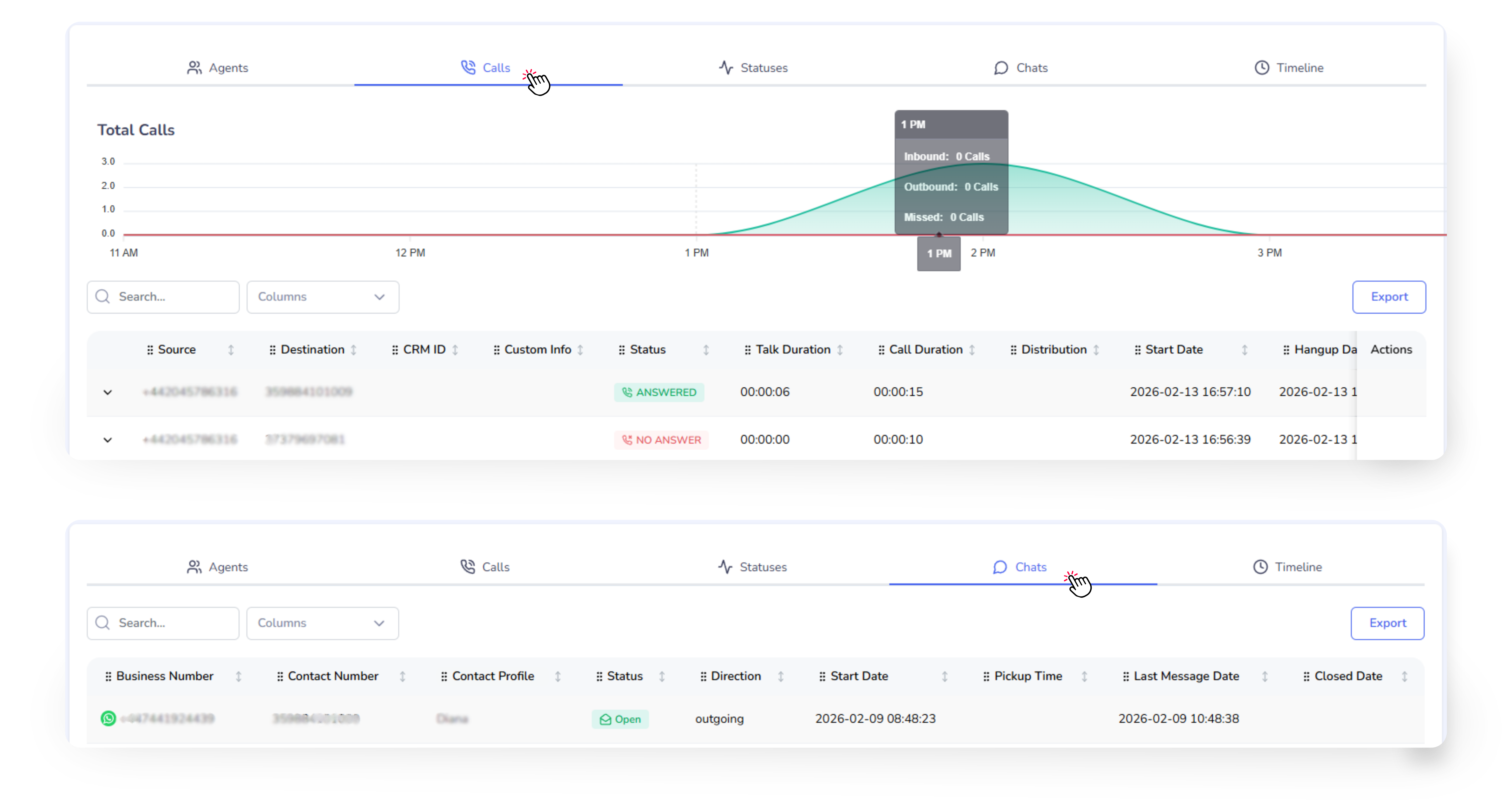 Check your calls and chats activity(source, destination, duration, timestamps, chat statuses, and call recordings) under Calls and Chats Tabs.
