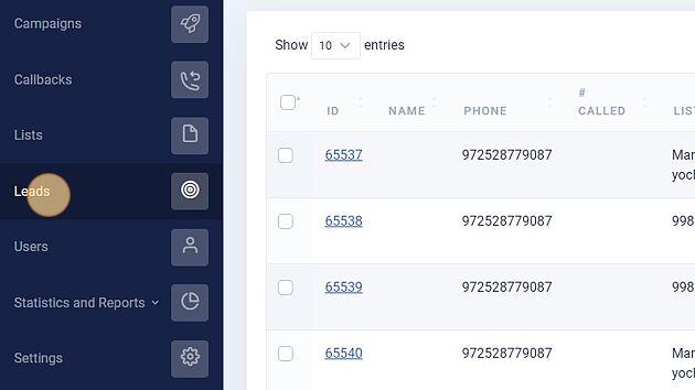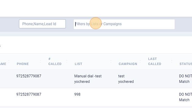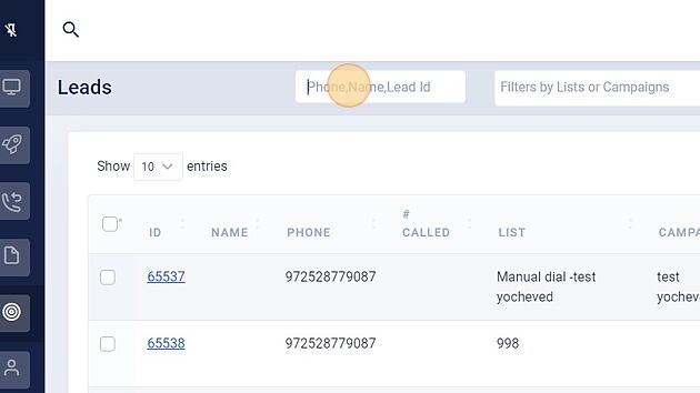 2. לחץ על השדה "חפש" כדי לחפש טלפון ספציפי, שם, מזהה לידים וכו'.